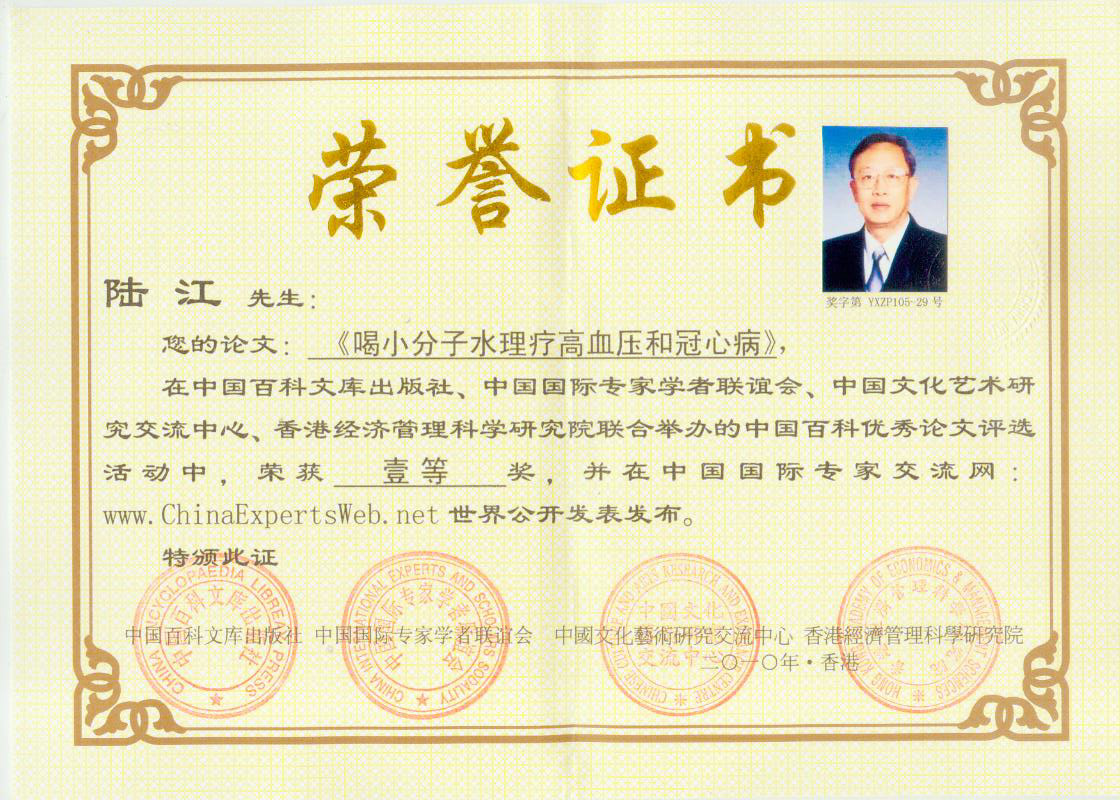 -----我是從事建筑的高工,本來沒有資格去攻克醫學難題,卻為了自身健康才扣響醫學的大門。由于我1990年患高血壓,因怕中風才研究發明了離子水瓶,我把水處理成微小分子團水,飲用后治愈了高血壓。便于1993年底送到三家省級醫院做臨床試用4個月。經北京和廣西醫學專家鑒定:"降脂降壓效果好"," 能擴大心腦動脈流量,改善心腦電圖以及微循環","對治療心腦動脈粥樣硬化、高血壓、高血脂有良好的醫療保健作用。""產品的技術性能和療效達到了同類產品的國內領先水平,經廣西醫學科學情報研究所檢索,未見國外有類似報道。"中國醫學科學院張正國教授從美國國立醫學圖書館數據庫存Medline檢索英俄文資料,均未見類似報告。2000年上市后,我為了對消費者負責而繼續觀察研究,一直通過《信譽卡》和《質量跟蹤調查書》向患者承諾療效,請用戶使用6個月后反饋效果。和脂壓患者飲用2至5個月內,消除癥狀,停服藥物,血壓正常;冠心病患者飲用3~5個月逐漸減輕至消除心絞痛、房顫等癥狀,不再服藥,飲用1年左右心電圖正常,經冠脈造影掃描無明顯狹窄,表明冠心病痊愈。大量患者還反映許多衰弱器官被修復,讓前列腺增生、慢性咽喉炎、慢性氣管炎、支氣管炎、慢性胃炎、腸炎和膽囊炎等不藥而愈;2型糖尿病患者是因為胰島衰弱致病,飲用該水半年至一年,逐漸減藥至停藥,血糖尿糖正常,真正治愈2型糖尿病。中風后遺癥患者飲用六七個月,可逐漸減輕至消除肢體和語言障礙,表明飲用該水能讓壽命很長的神經元細胞逐漸修復,奇跡般地恢復肢體和語言功能。飲用后還使胸腺和脾臟兩個重要的免疫器官被修復和增強,產生免疫細胞多,提高了免疫力,使人不生病或少生病。自此, 飲用微小分子團水創造了攻克冠心病、高(低)血壓和糖尿病三大醫學難題的奇跡。人們對此感到不可思議,但實踐是檢驗真理的唯一標準。